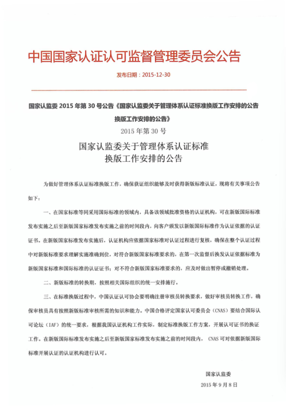 國家認(rèn)監(jiān)委2015年第30號公告《國家認(rèn)監(jiān)委關(guān)于管理體系認(rèn)證標(biāo)準(zhǔn)換版工作安排的公告換版工作安排的公告》